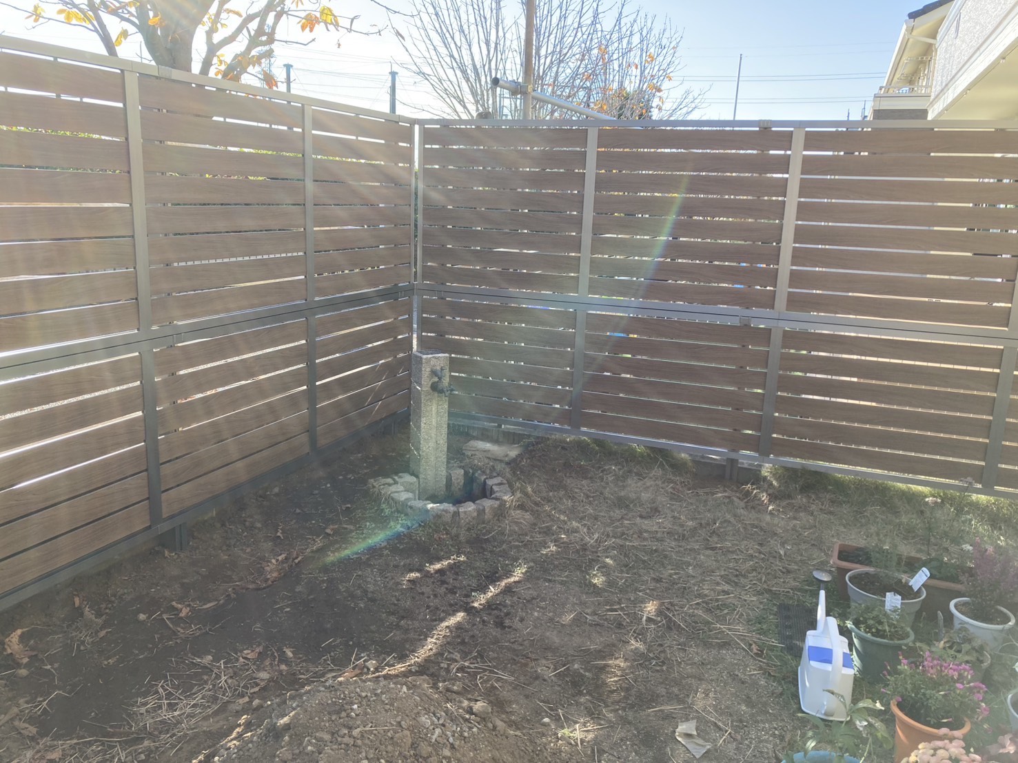 1段上がった位置に遊歩道があり、庭に落ち葉や枯れ葉が吹き込んできてしまうとお悩みでした。多段柱を使用することで背が高いフェンスの施工が可能です。木調にすることで、ワンランス上のプライベート空間に大変身です!